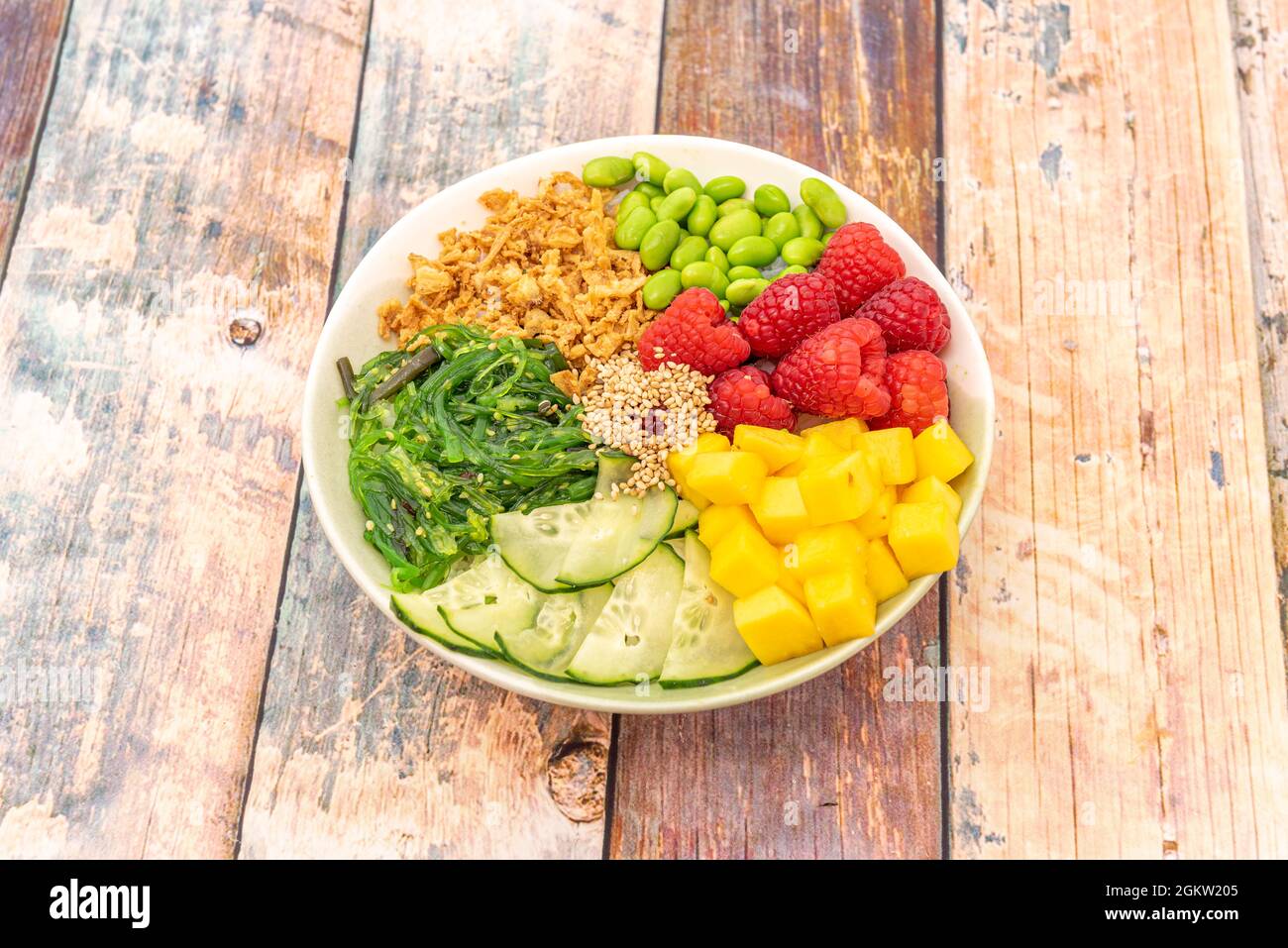 Vegan Poke Bowl With Red Raspberries Wakame Seaweed Salad Chopped Ripe Mango Crispy Onion Edamame Beans White Rice And Sesame Poppy Seeds Stock Photo Alamy